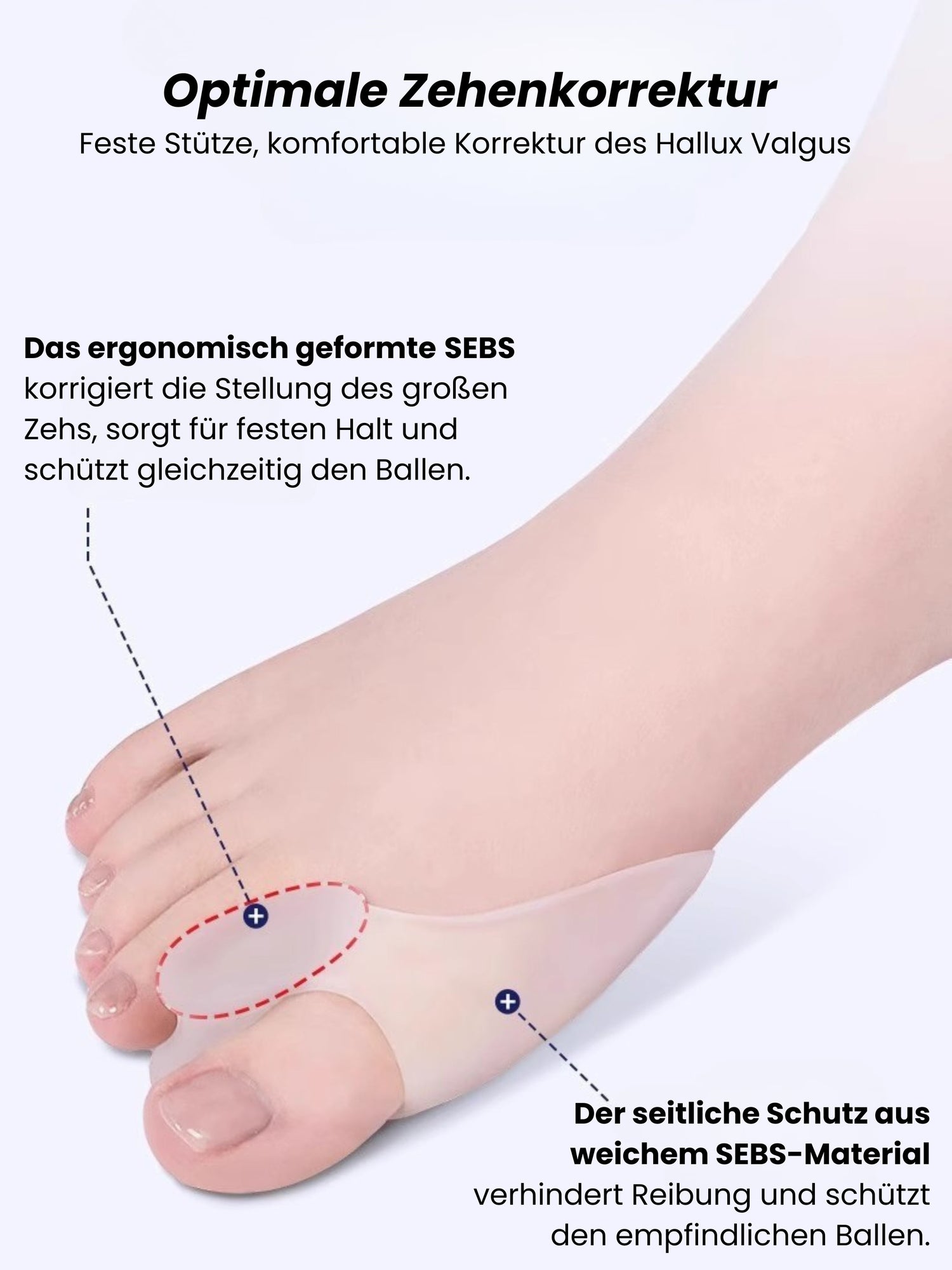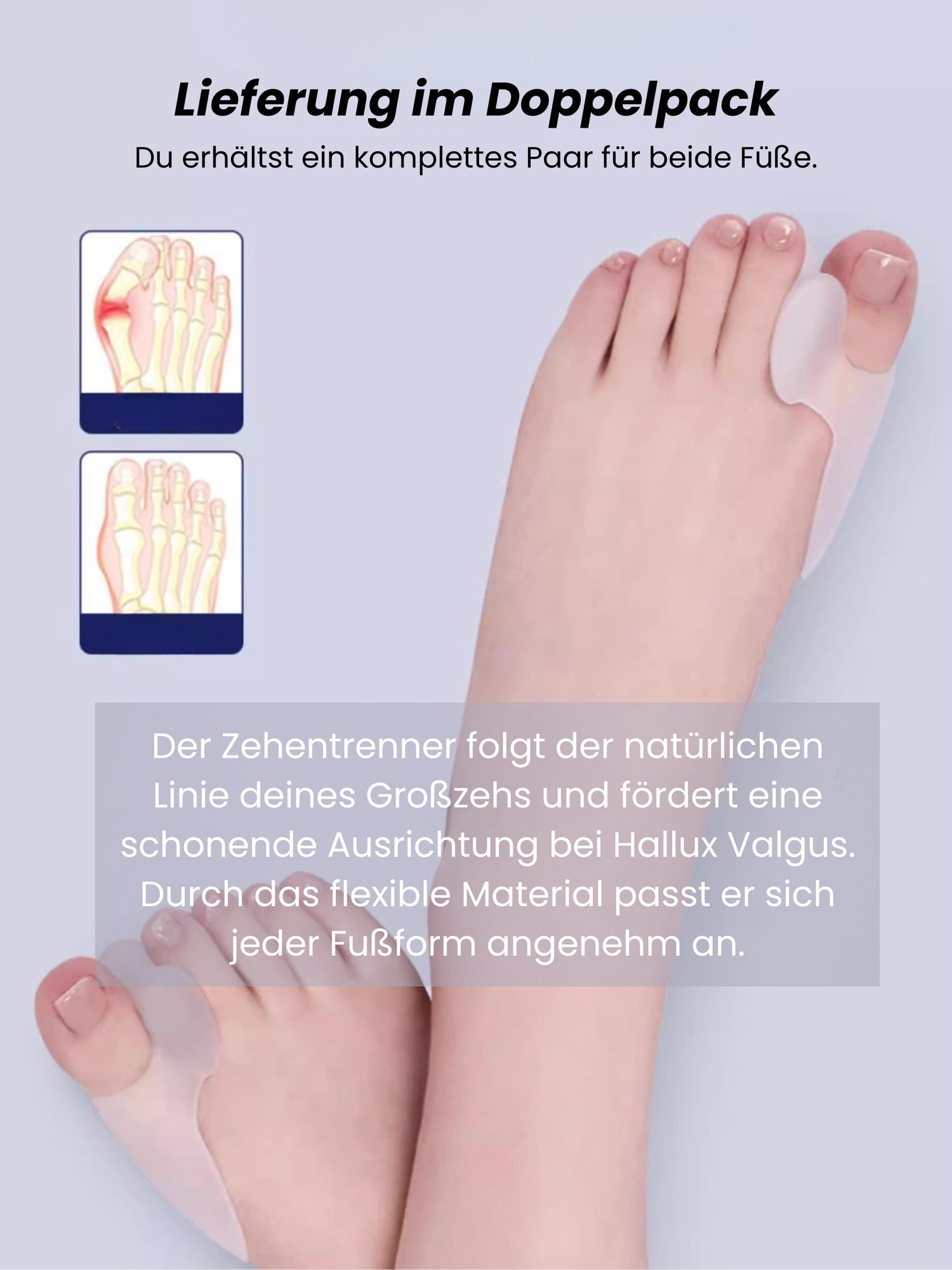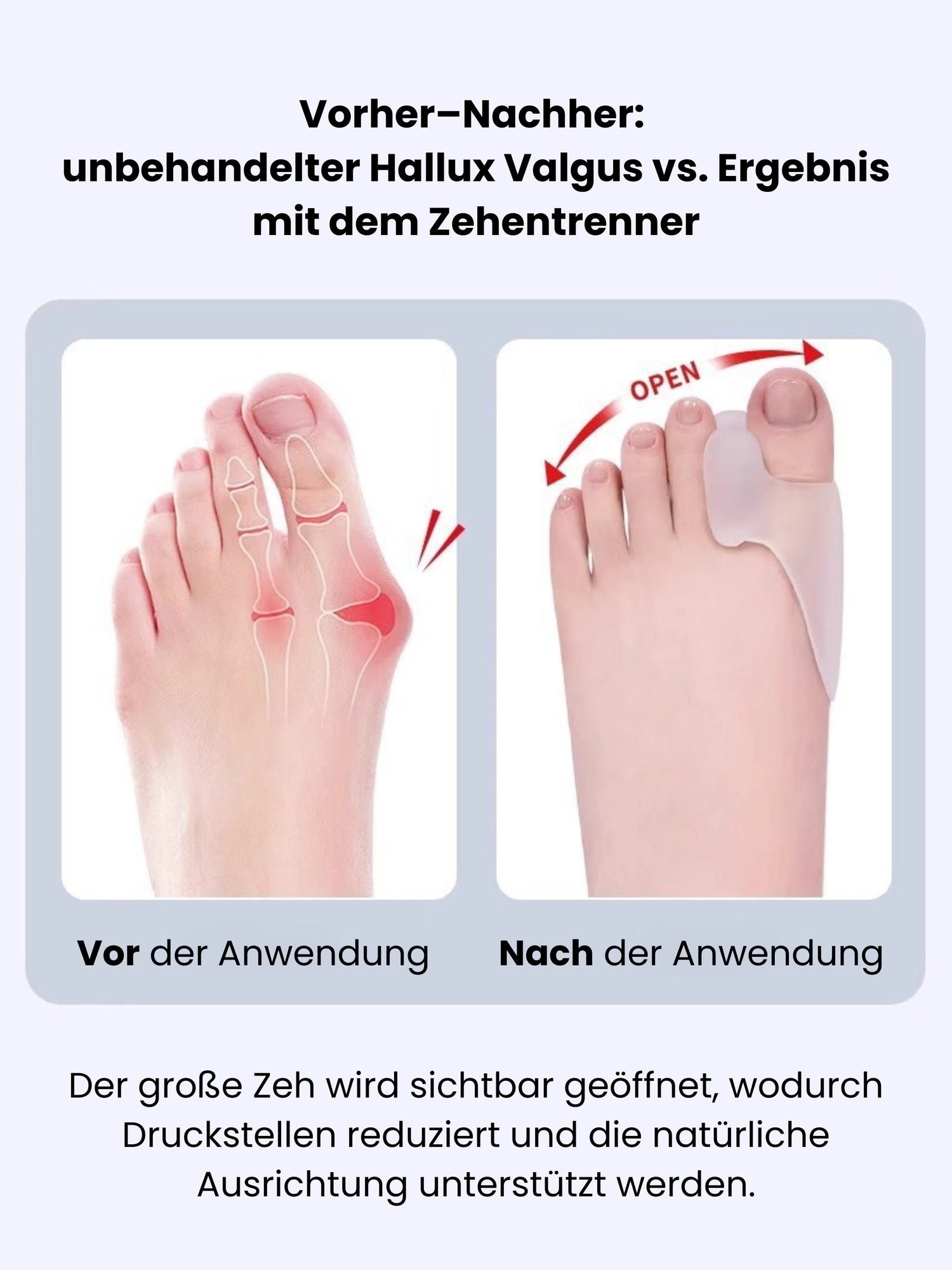 Bei regelmäßiger Anwendung kann der AlpenCare™ Zehentrenner die Zehen in eine natürlichere Position führen und Beschwerden lindern. Er ersetzt jedoch keine ärztliche Behandlung und ist nicht zur medizinischen Korrektur ausgeprägter Fehlstellungen gedacht.