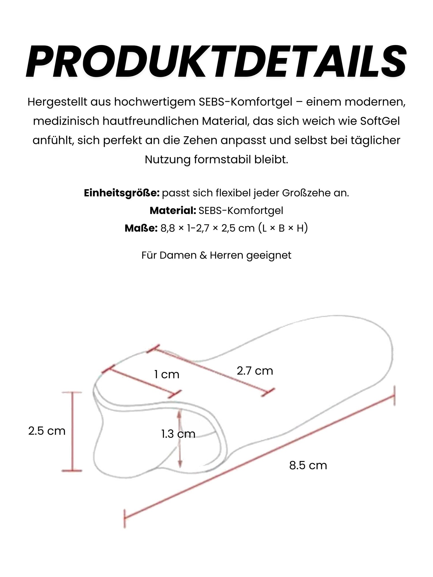 Ein hochwertiges medizinisch hautfreundliches Material das sich weich wie SoftGel anfühlt, sich perfekt an die Zehen anpasst und selbst bei täglicher Nutzung formstabil bleibt.